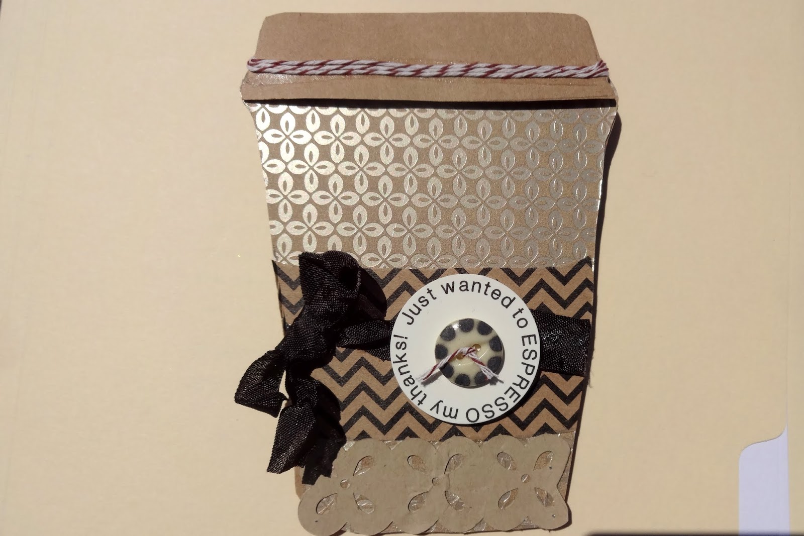 The paper collection I used is patterned cardstock from Coredinations the ink is Versamark onyx black . The ribbon is from my "Coffee house bundle" (latte). The cut file I used is "Tea box holder template.