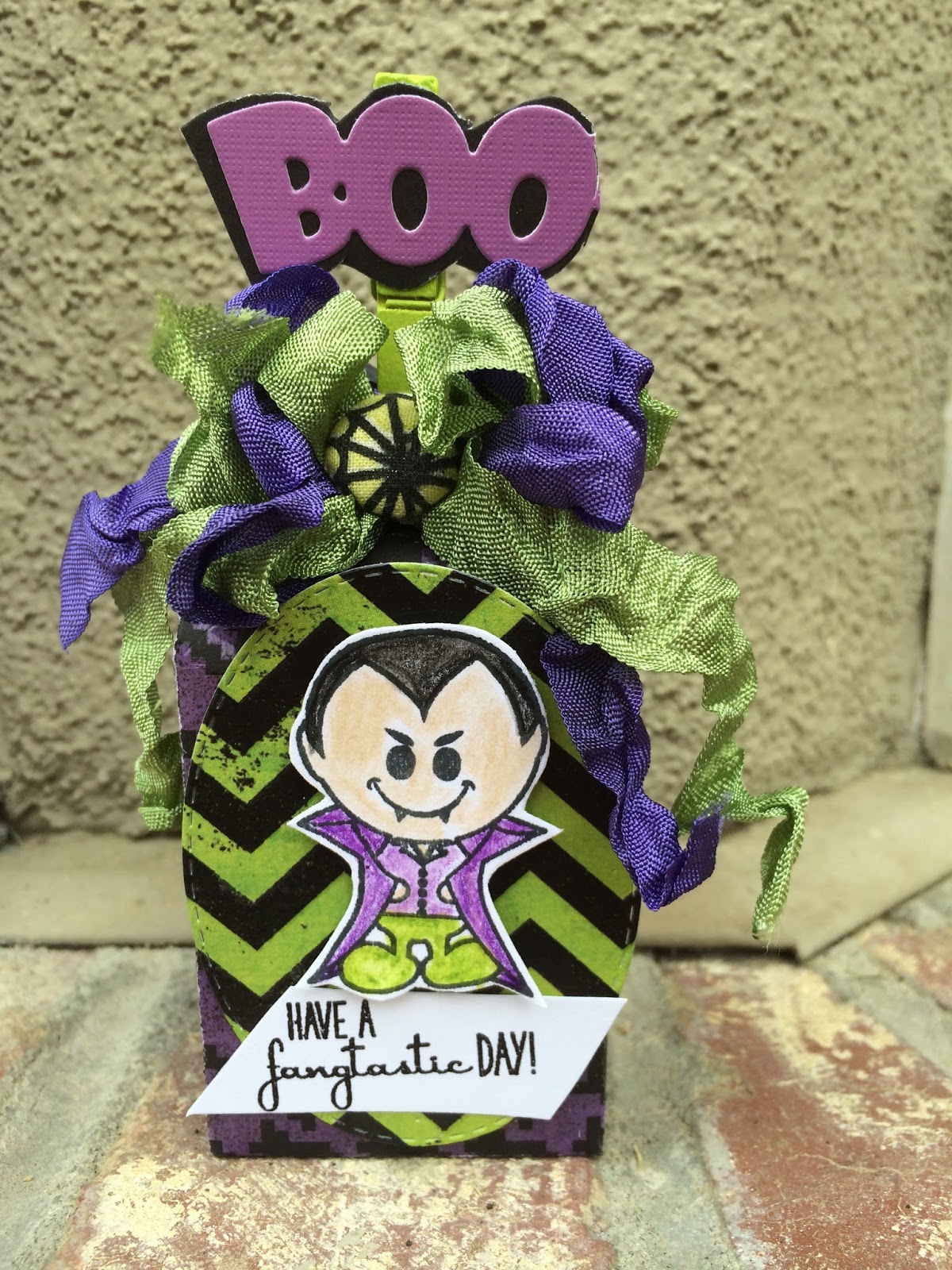 The treat bag and candy stickers are from cut above Halloween treat bag kit. I used archival black ink with the stamp set " sweet salutations ". The ribbon is from my " Halloween bundle" (Ghoul green).